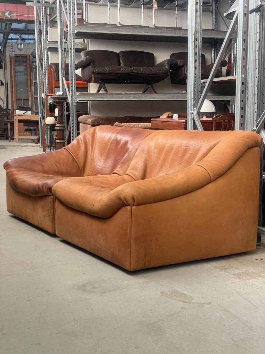 Deze vintage modulaire bank De Sede DS-46 in cognac leer is een iconisch Zwitsers design uit de jaren ’70. Het leer heeft een prachtige, doorleefde patina die zorgt voor een warme en karaktervolle uitstraling. Dankzij de losse modules is de bank flexibel samen te stellen en past hij moeiteloos in verschillende interieurs. De natuurlijke gebruikssporen onderstrepen de authenticiteit en maken deze designklassieker uniek.