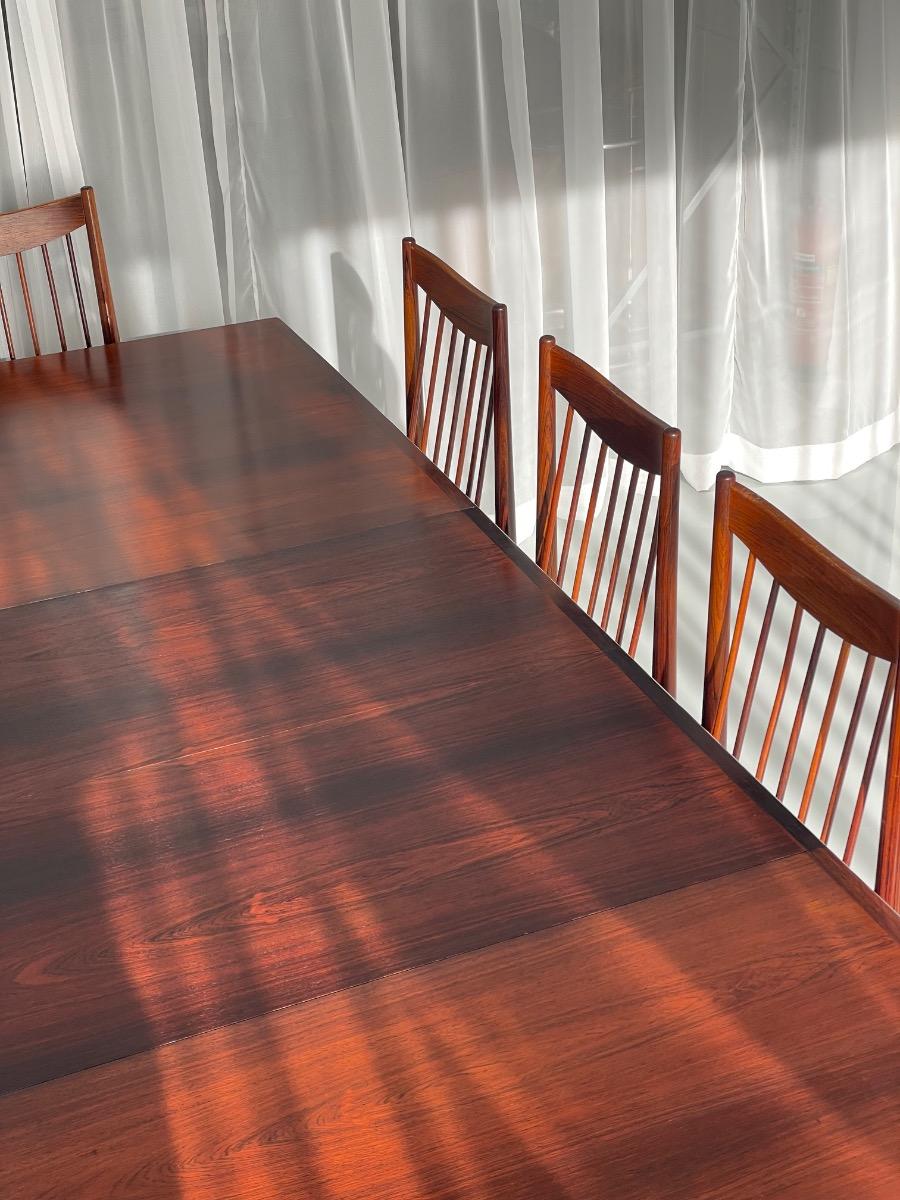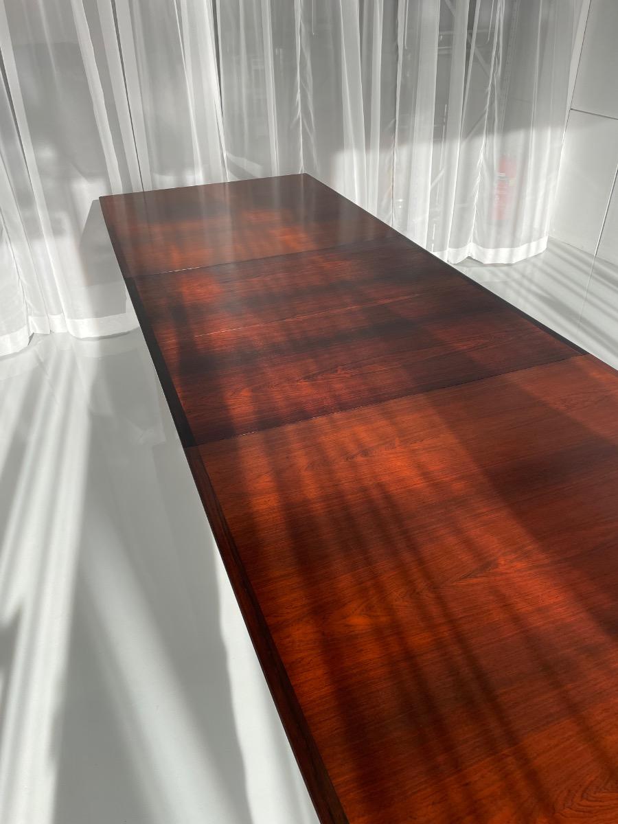 De bijbehorende eettafel, eveneens vervaardigd uit hoogwaardig palissanderhout, heeft een royale lengte van circa 300 cm en is ideaal voor grote gezelschappen. Door het inschuifbare systeem kunnen de twee tussenbladen eenvoudig worden weggeschoven, waardoor de tafel ook in een compacter formaat gebruikt kan worden.