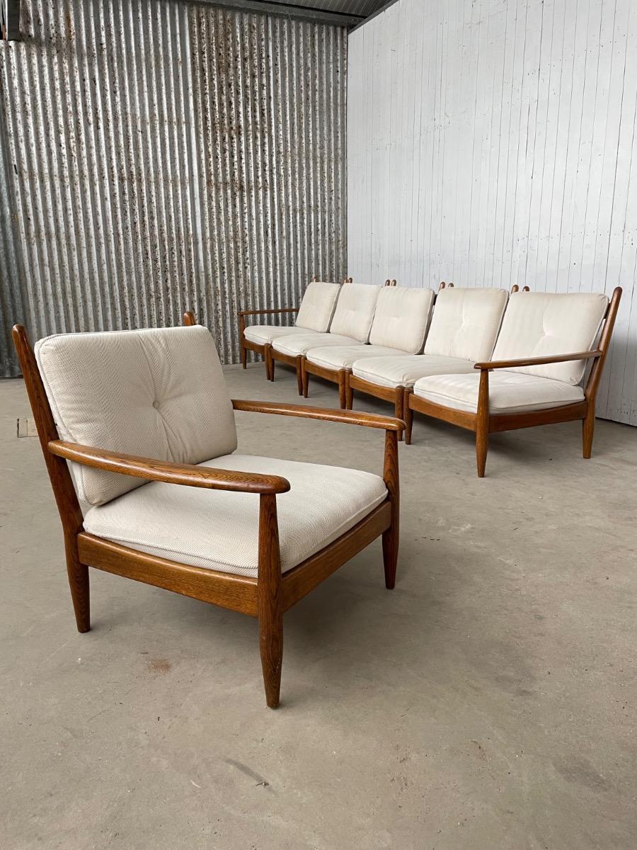 Vintage modulaire bank uitgevoerd in eiken met witte stoffering. De bank bestaat uit 5x elementen. De losse armstoel is ook te koop voor €450,-