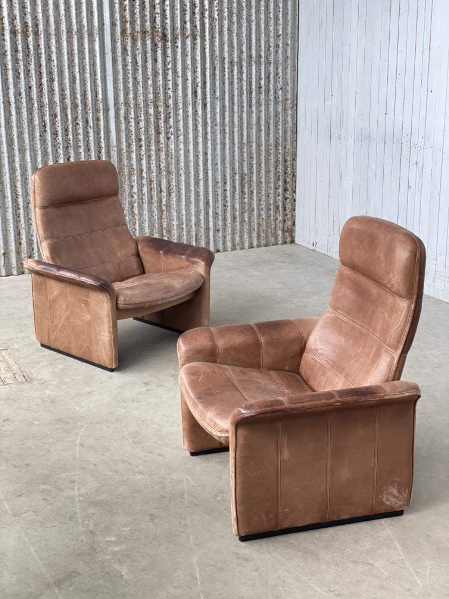 Set DeSede loungestoelen DS-52 ontworpen door het deSede designteam in de jaren 80. Dit paar stoelen heeft een zeer comfortabele zitting en een verstelbare rugleuning. De meest voorkomende versie van dit model is de "DS50" bekleed met gewoon leer. Dit model DS-52 is een exclusief paar stoelen bekleed met dik buffelleer, puur vakmanschap.